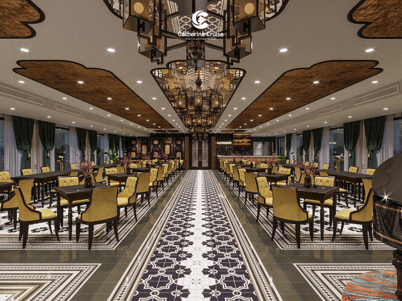 Du thuyền Catherine Cruise còn tạo dấu ấn đáng nhớ với du khách bởi hai nhà hàng mang 2 cái tên khá đặc biệt. Khu vực tầng 2 là nhà hàng Harmonia khá cổ điển nhưng vẫn tôn lên sự quý phái và sang trọng, cung cấp thực đơn buffet. Còn tầng 4 là nhà hàng Ambrossia, chuyên phục vụ menu quốc tế.