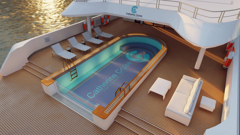 Trên du thuyền Catherine Cruise, hồ bơi vô cực là một trong những tiện ích thú vị. Bạn thỏa thích bơi lội, tận hưởng sự mát mẻ. Bể bơi có hệ thống lọc nước để đảm bảo luôn sạch sẽ và an toàn. Tại đây, bạn còn có cơ hội tham gia các hoạt động thể thao và giải trí khác xung quanh.