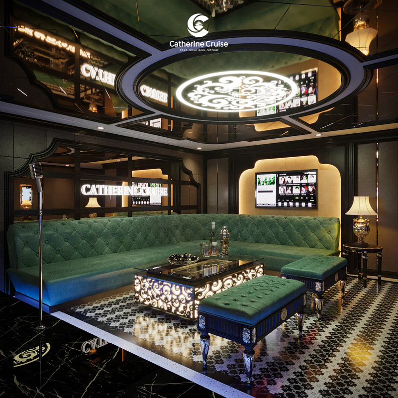 Catherine Cruise cũng thiết kế 2 phòng karaoke quy mô diện tích tổng lên tới 80m2. Mỗi phòng có chất lượng cách âm hoàn hảo, cung cấp giàn ánh sáng và âm thanh tốt nhất. Đây chính là không gian tuyệt vời để bạn thư giãn bên mọi người.
